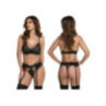 Ensemble de lingerie 3 pièces noir mettant l'accent sur les détails raffinés et la coupe parfaite. Le soutien-gorge à armatures offre un maintien léger et est orné d'une broderie en forme de feuilles filigranes qui se prolonge harmonieusement sur le porte-jarretelles et le string. Des lanières décoratives apportent une touche moderne et soulignent la silhouette. Les bretelles réglables et les agrafes permettent un ajustement personnalisé et un grand confort. Les jarretelles sont amovibles et offrent de nombreuses possibilités de style. Les bas ne sont pas inclus.