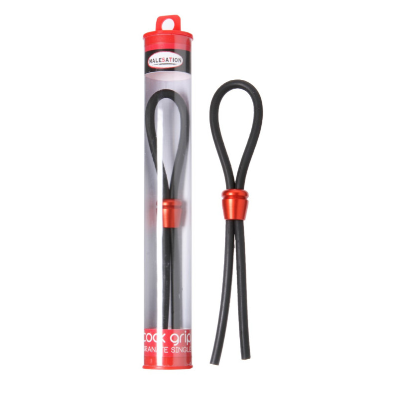 La boucle est glissée autour du pénis en érection, puis resserrée (serrez selon votre ressenti- risque de congestion des veines). Attention: soyez attentif à ne pas coincer la peau. Caractéristiques: boucle en caoutchouc noir NBR - élastomère (nitrile), Ø 5 mm, dureté: 70 Shore. Haute résistance et élasticité. Très résistant aux huiles, à l'essence et à la chaleur. La bague de serrage est en aluminium dur, traitée avec une couleur anodisée. Pour le nettoyage, utilisez un désinfectant, par exemple MALESATION Cleaner Toys & Body.