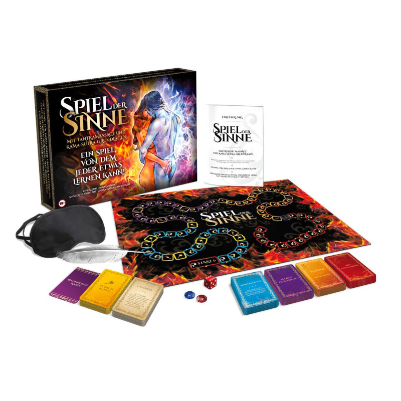 Contenu de la boite: 1 vidéo animée avec des techniques de massage, environ 18 minutes 1 mode d'emploi 1 plateau de jeu avec 78 cases 149 cartes d'actions 1 mouchoir en soie noire 1 plume d'oiseau 2 pierres de cristal (jetons) 1 dé