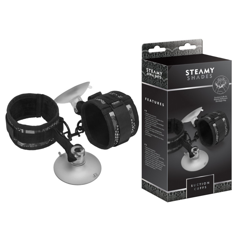 Adapté aux novices, ventouses pour une assise sûre sur toute surface lisse, parfait pour les jeux de bondage dans la salle de bain, légèrement rembourré pour plus de confort, fermetures auto-agrippantes pour un bondage sûr et un retrait simple, dentelle noire élégante sur tissu gris brilliant
