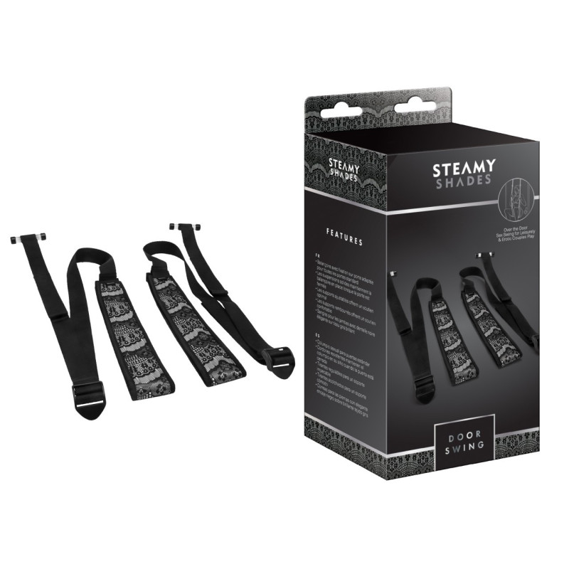 Balançoire avec fixation sur porte adaptée pour toutes les portes standard, les suspensions solides maintiennent la balançoire en place lorsque la porte est fermée, les supports ajustables offrent un soutien optimal, les supports rembourrés offrent un soutien confortable, sangles pour les jambes avec dentelle noire élégante sur tissu gris brillant